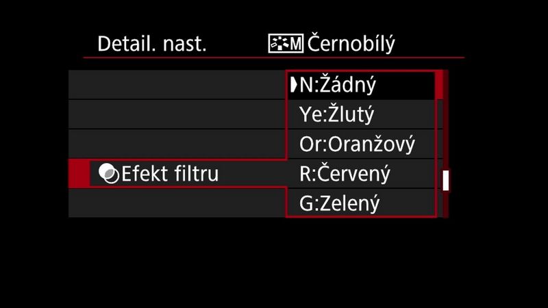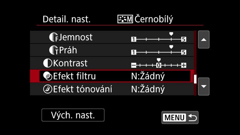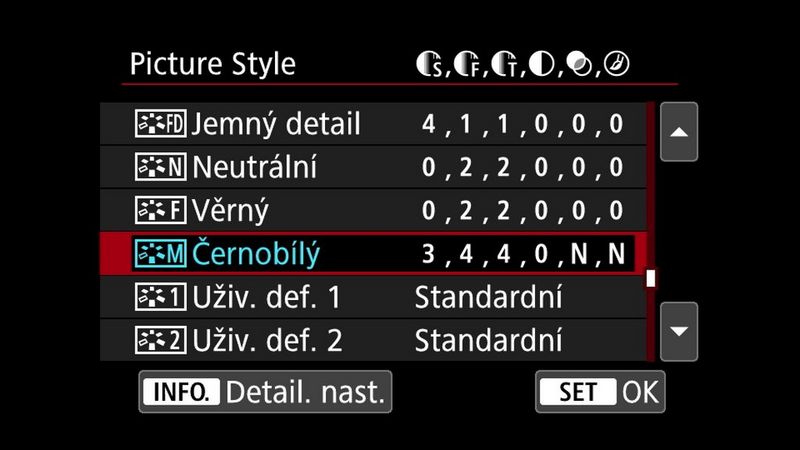 Podobně jako u ostatních možností stylu Picture Style můžete i černobílý styl přizpůsobit a dosáhnout celé řady různých vzhledů. Chcete-li to provést, označte jej v nabídce stylů Picture Style a stiskněte tlačítko INFO.