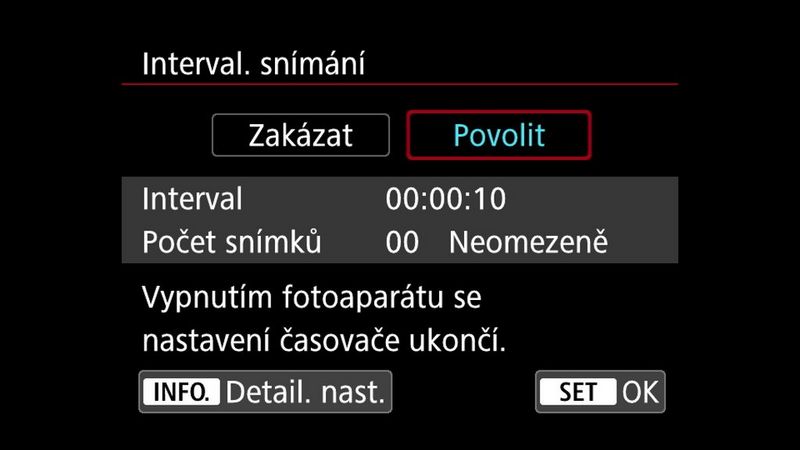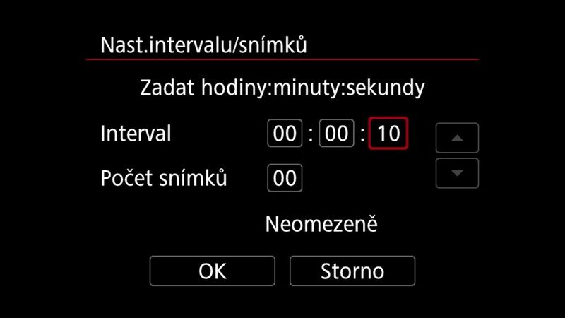 Jakmile je tato možnost aktivní, budete moci nastavit interval mezi jednotlivými záběry a počet snímků, které chcete pořídit pro celé video. Při zadávání těchto počtů fotoaparát zobrazí, jak dlouho bude trvat sekvenci vytvořit a dobu trvání dokončeného filmu. Ujistěte se, že máte dostatečně nabitou baterii, abyste mohli nafotit všechny záběry!
